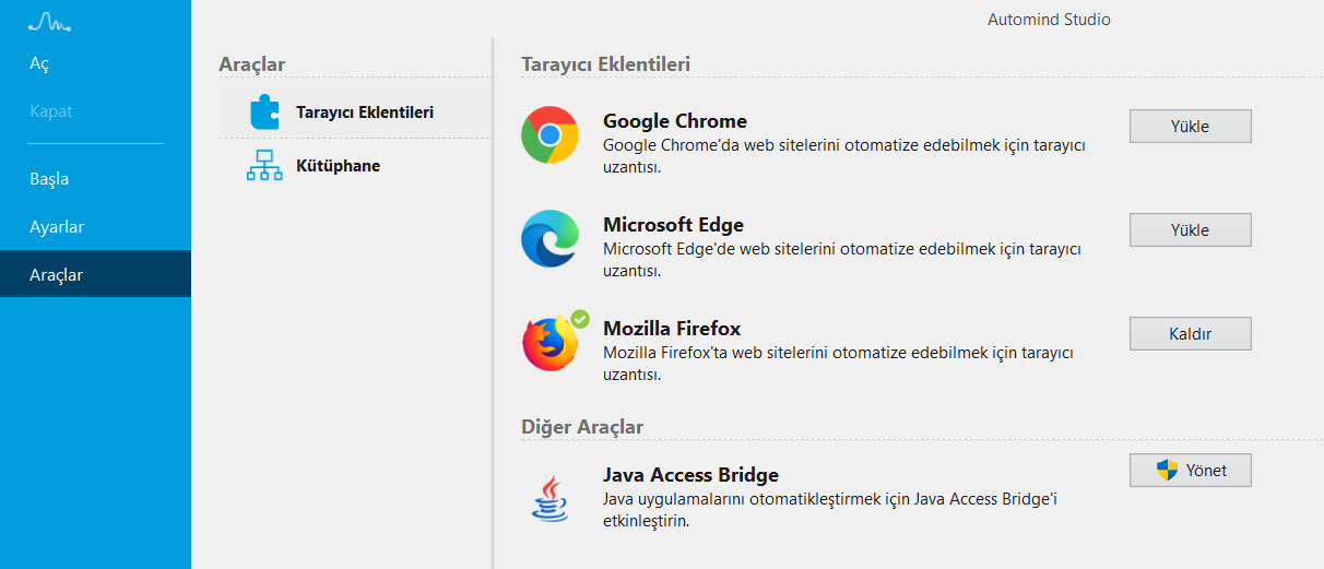 Eklentinin yalnızca Araçlar menüsü üzerinden yönetilmesi gerekmektedir. Aksi takdirde otomasyon aracının düzgün çalışması engellenebilir.