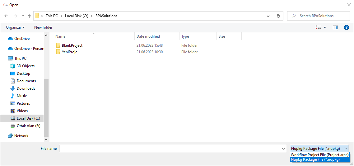 - In the opened window, select the Workflow Project file (.xaml) or the Nuget Package file (.nupkg) to open the appropriate project.
